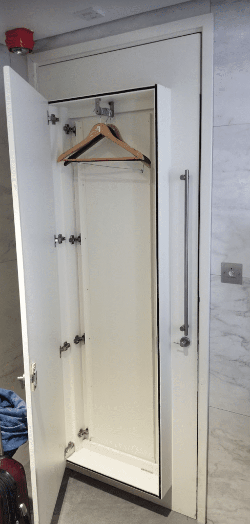 There’s also a small closet to hang your clothes up if you need, though obviously that was not needed in my case. Valet ironing is also available at the AA London Heathrow Arrivals Lounge, though again I did not use it.