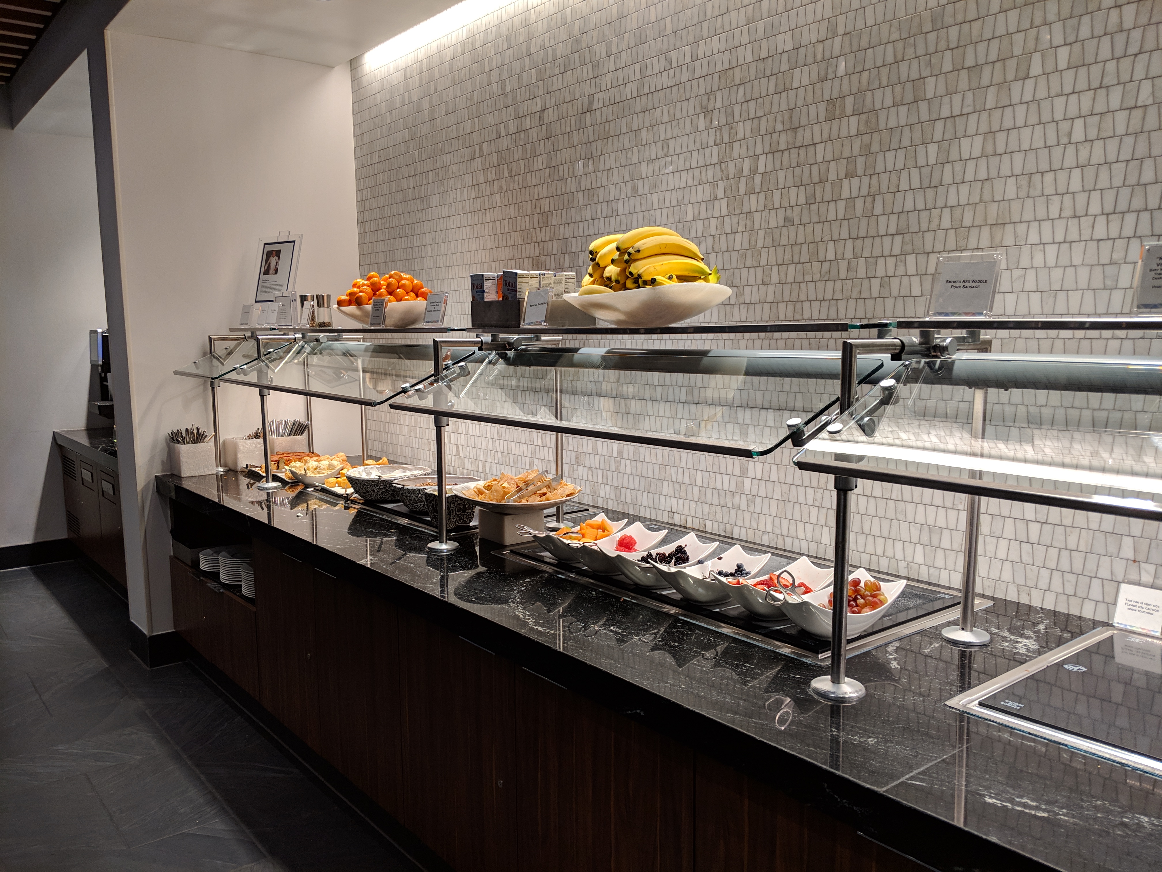 We stayed at the Centurion Lounge from around 5:45AM to 7AM on a Friday morning, so we got to sample their breakfast menu. The lounge has an assortment of continental items in the morning (and I assume throughout the day) including fruit, yogurt, cornbread, scones, and blueberry bread. The hot breakfast was brought out at 6:30AM. Pancakes, sausages, an egg scramble and an egg frittata, and hot porridge were added to the spread.
