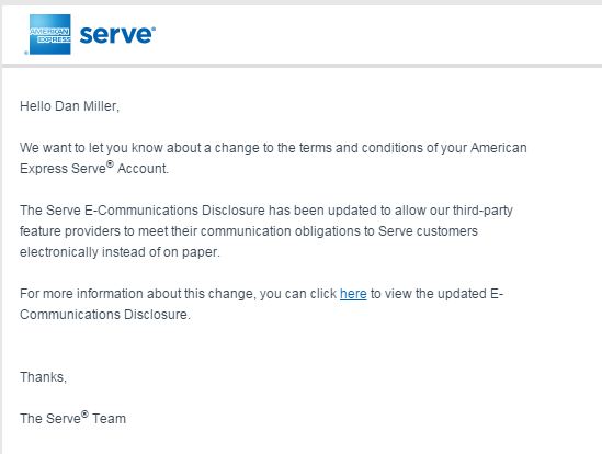 Oh, the “Serve E-Communications Disclosure” has been updated!! I’m glad they decided to let us know that, especially given the fact that they apparently did not feel the need to let anyone know when they updated the terms and conditions to specifically include the words “manufactured spending”. It appears too that everyone with a Bluebird / Serve account got this email, even people whose accounts had previously been load limited.