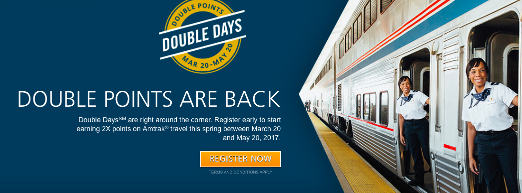 • Earn double points on qualifying Amtrak travel from March 20 12:00:00am CST through May 20, 2017 11:59:59pm CST