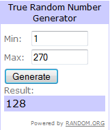 We had 119 comments and 151 newsletter signups (!) for a total of 270 entries.  Labeling the commenters first from 1-119 in order of their comment, and the newsletter subscribers from 120-270 in order of their signup date, I went to our friend random.org