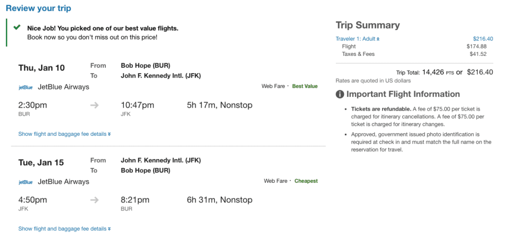 Sample from BUR to JFK RT $216 or 14K Ultimate Rewards