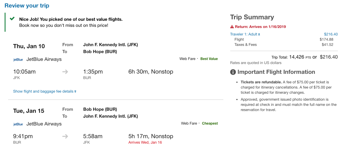 Sample from JFK to BUR RT $216 or 14K Ultimate Rewards