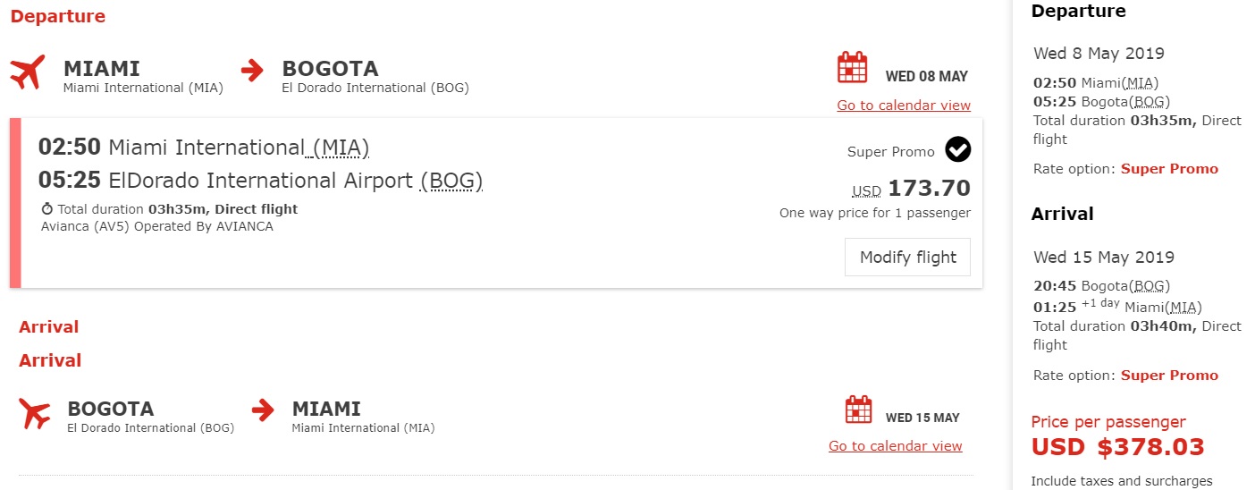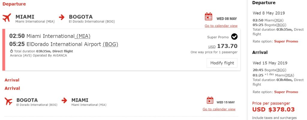 While these are the advertised fares, lower prices can be found. For instance: I found rates from Miami to Bogota from $378 round trip (see example). These are basic economy fares, including a checked bag and meals but not seat selection. These fares also earn Avianca LifeMiles at 50% of distance flown; rate for other Star Alliance partner programs can be found at WhereToCredit.com. But while LifeMiles is considered to have some great awards deals, they are also known as a difficult program to deal with at times. Act quickly: these fares are only good through April 8, presumably midnight Bogota time.