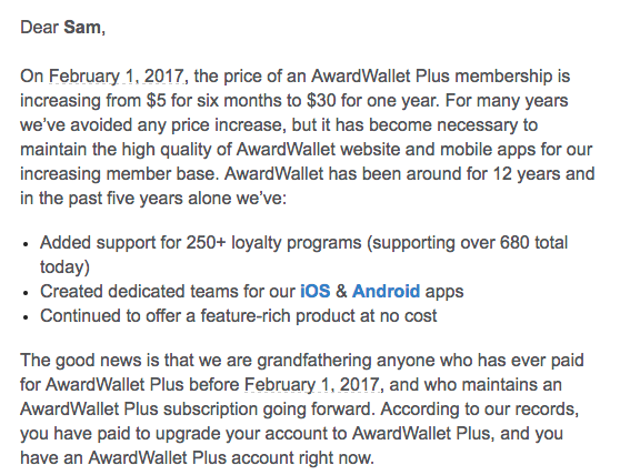 As you can see above, there is some good news for those who have ever paid for the AwardWallet Plus service. Those individuals will be grandfathered into the old price of $10 per year. To me, this is a no-brainer, as I’ve come to rely heavily on AwardWallet Plus.