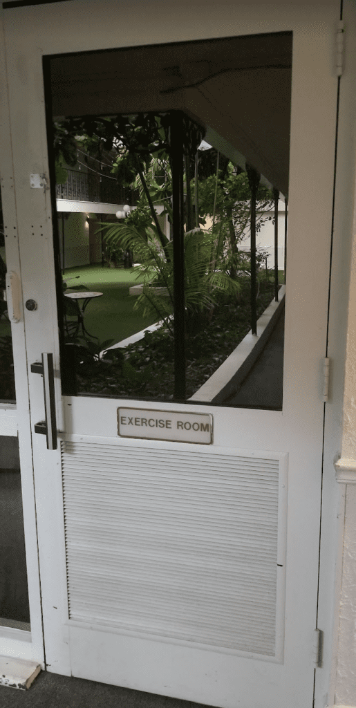 When you walk in, the hotel lobby was open with the rooms surrounding this central foyer. It was a bit….. odd looking, with tons of plants / trees and artificial grass on the floor.