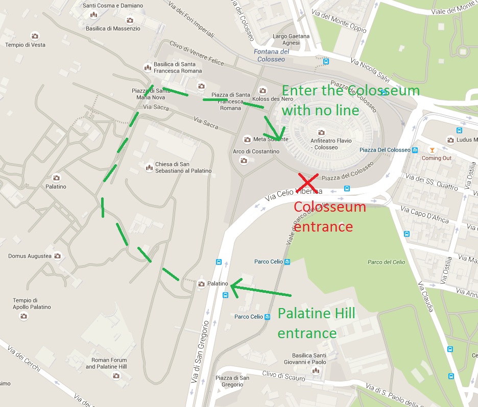 Here’s a map of the area, with the Colosseum in the top center of the map. Rather than going to the Colosseum (the big Red X), just walk down the hill to the Palatine Hill entrance (the green arrow on the map below). On our 2024 trip, our hop on, hop off bus actually dropped us off down here at the “Colosseum” stop, so it was even easier.