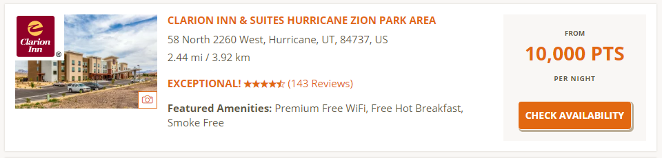 Choice Privileges doesn’t publish an award chart. Their properties start at 6,000 points per night at the most budget places, and award costs can reach upwards of 35,000 points. Award rates also fluctuate. Most of their properties in the U.S. are budget to midscale, including brands like Rodeway Inn and Comfort Inn and Suites. They are nothing to write home about in terms of quality or aspirational experience, but if you’re simply looking for a place to stay while you visit a National Park, they may be just the thing. Coverage in the U.S. is generally exceptional. Consider this hotel near Zion National Park in Utah: