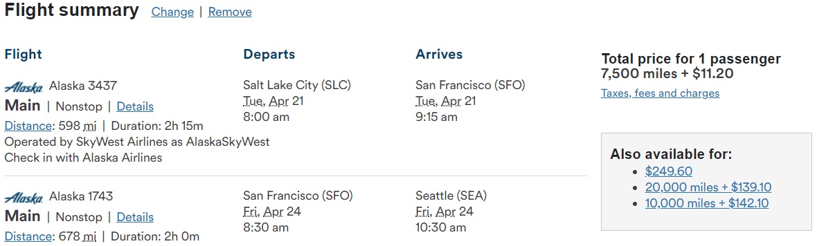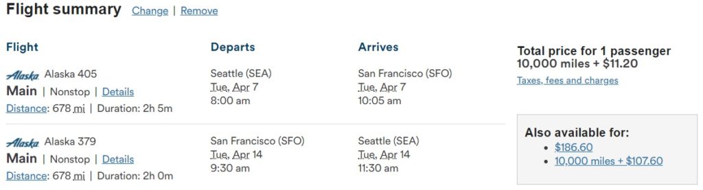 Alaska doesn’t have “web specials” like American, and thus the miles for this deal aren’t quite as lucrative. Alaska prices its rewards flights by distance, so shorter flights are generally cheaper. 11,000 miles from your premium economy trip can get you a round trip shorter than 700 miles. For instance: Seattle to San Francisco (+ $5.60 each way).