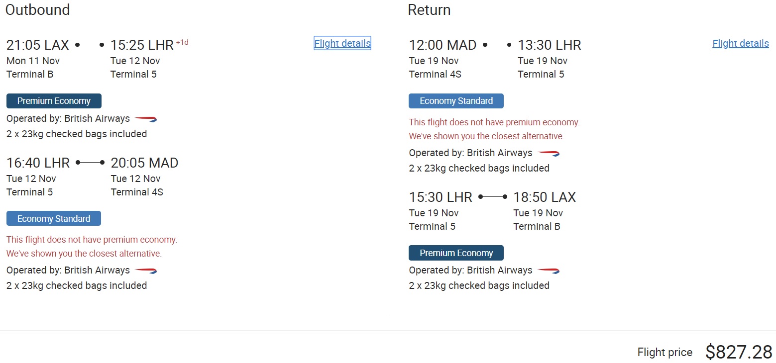 Earning Alaska Miles on British Airways is also a little tougher than earning miles for AA. Alaska only uses its British Airways partner chart for flights marketed and operated by BA. That limits your flight options. Still, it wasn’t too hard to find BA flights from L.A. to Spain. Main cabin economy runs $540 – $580 generally, so this fare averages ~$270 more than sitting in the back.