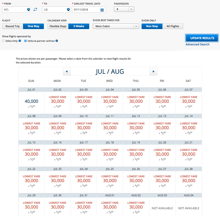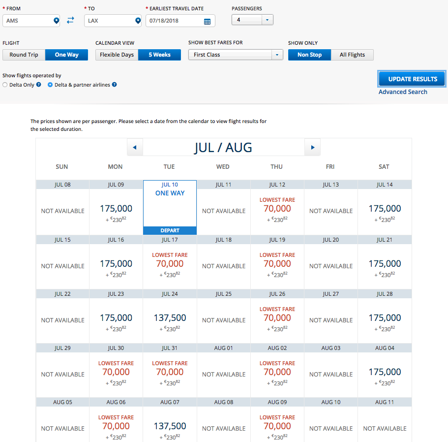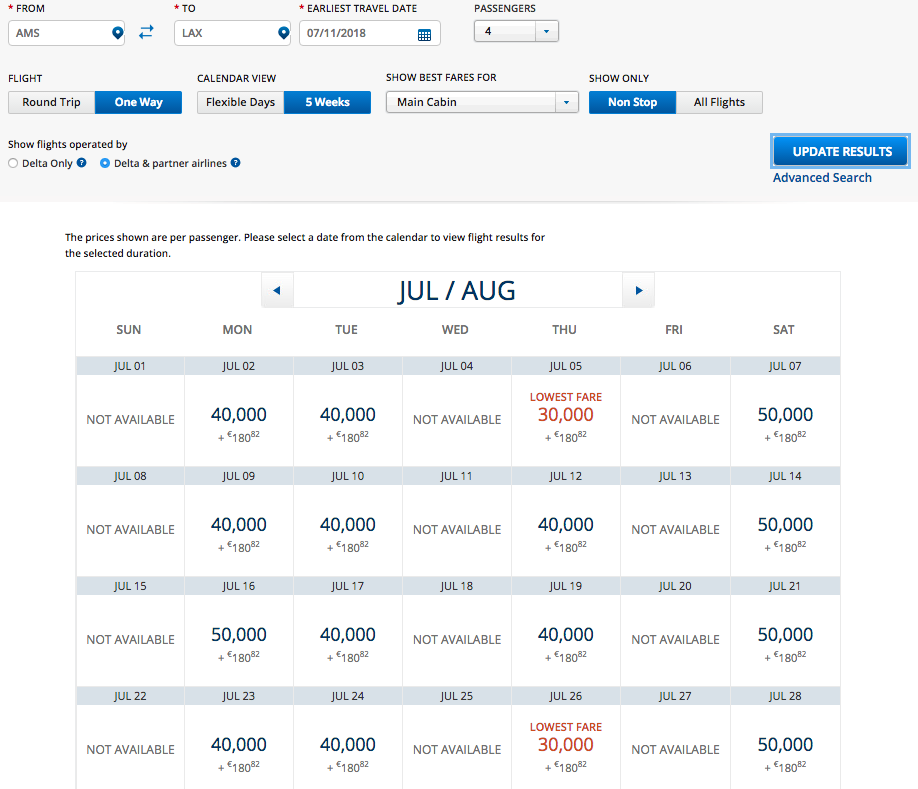 I looked up award space from Los Angeles to Amsterdam in June 2018 for a family of four using Delta’s flexible calendar. Many dates have the low-level awards available in both coach and Delta One business class!