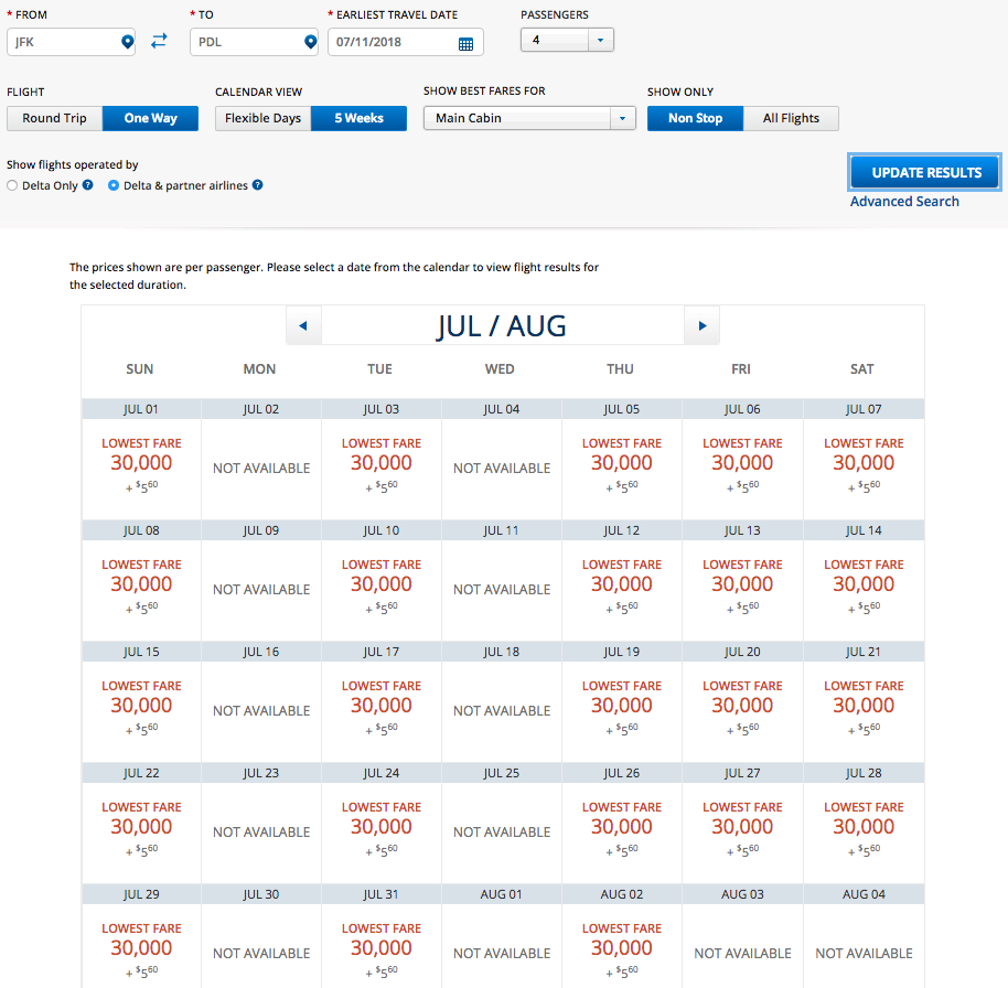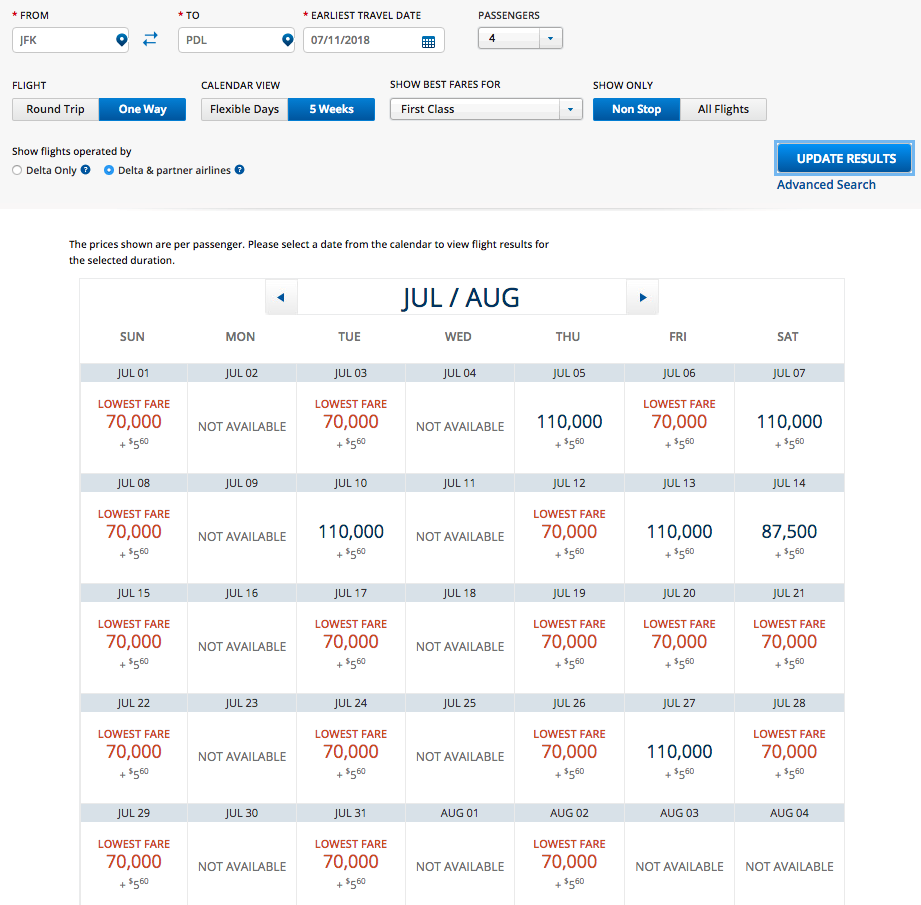 Here’s what award spaces look like for four people from JFK to Azore in both Delta One business class and regular economy: