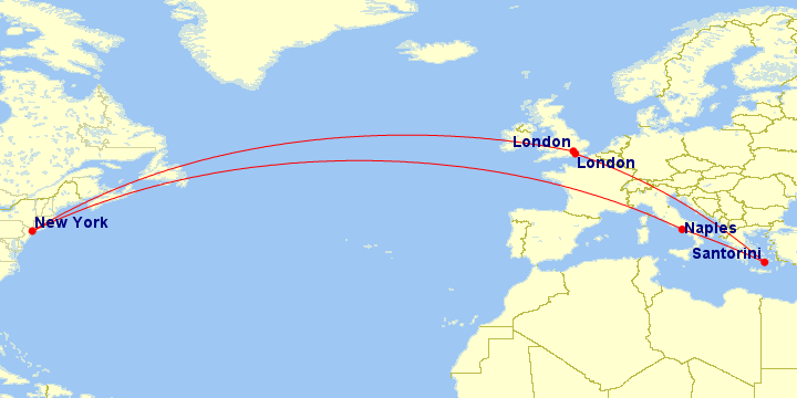 As you can see, we’re doing stops in Naples (the term stop is being used loosely), Santorini, and London.