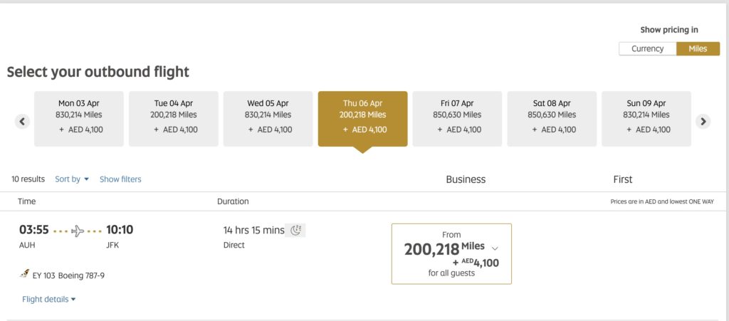 There was actually a ton of business class availability on IAD-CAI, but the route only flys Tuesday, Thursday and Saturday. So that started to set some constraints for the rest of the trip. Initially I wanted to follow Nick to Istanbul, but as I continued down the booking, I had to cut that leg, since the availability wasn’t great and also the extra day it added to the trip made it not work out for what I was trying to do. I mostly used Aeroplan’s site to check award availability, but I also occasionally used United for the month-long view. Etihad’s site was also super useful and easier to see availability weeks at a time. I learned that if it shows a price around 200,000 Etihad Guest miles, it would show up for Aeroplan. If a given date was closer to 800,000 miles, it would not