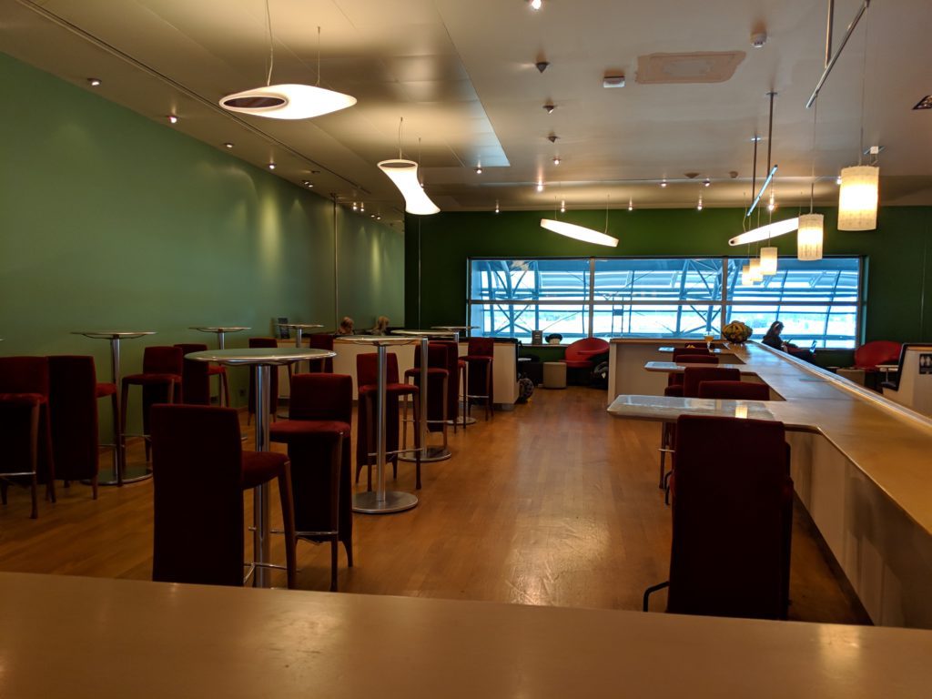The seating areas were comfortable and clean, if a bit dated. As soon as you check in, you’ll notice the large countertop at a window overlooking a small runway. The barstools are awkwardly tall, but the view is great! We posted up at the windows and watched a few flights come in while we ate. Turkish Airlines, Ryan Air, and TUI (which I’d never heard of before).