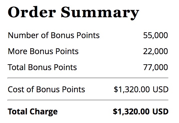 If you purchase the maximum allowed, you will receive 55,000 points plus 22,000 bonus points for a total of 77,000 points. The total cost is $1,320, about 1.71 cents per point. Last time they ran this promotion the bonus was 40% so it’s about as high as it’s been.