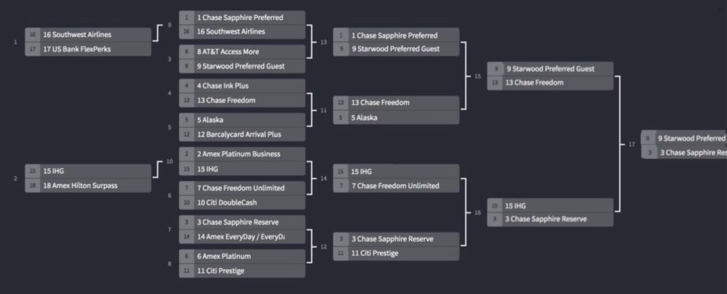 This year I thought I’d try a similar tournament to pick the “best” miles and points credit card. While the definition of a “best” credit card is fairly impossible to judge, since there are so many factors that go into that decision, most importantly figuring out where you want to go before you just sign up for cards, but hey, let’s give it a try!