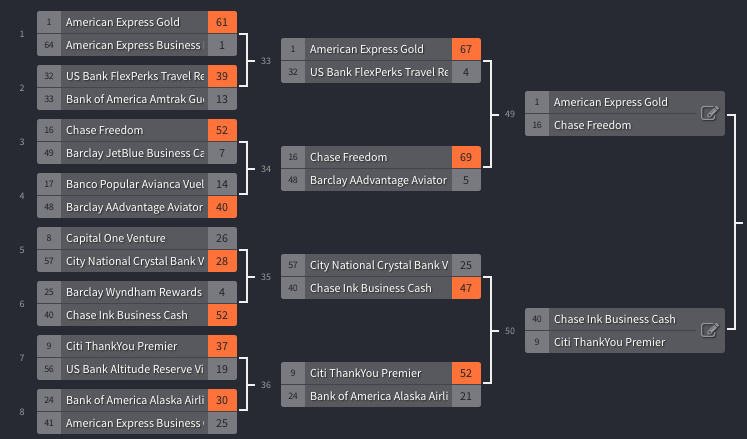 The AmEx Gold retains the Number 1 seed and moves onto Round 3, with a crushing defeat of the FlexPerks Visa Signature! Both cards offer flexible redemptions, but the recent improvements make the AmEx Gold a fantastic competitor in this tournament.