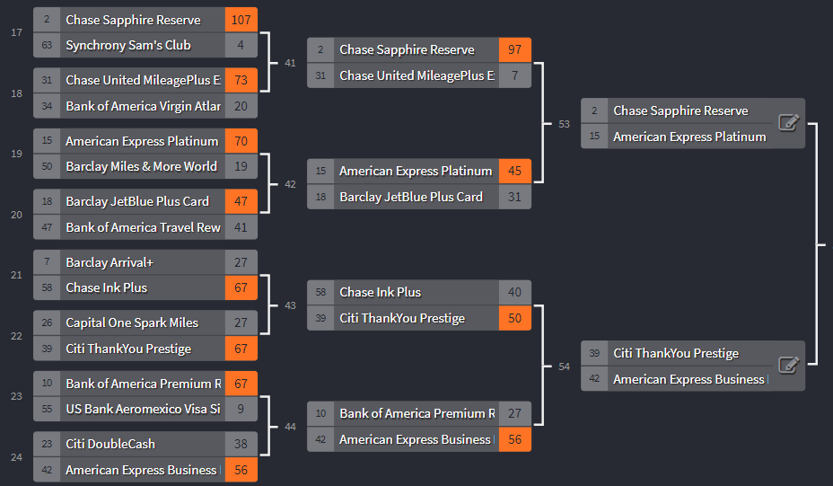 After tonight’s games, we’ll be well on our way to our final 16 teams! The Sapphire Reserve obliterates the MileagePlus Explorer below, and Barclay is onto its last stand in Game 47. With big wins last night from the Reserve, the Citi ThankYou Prestige, and the American Express Platinum, do our readers love shelling out money for their high end cards?