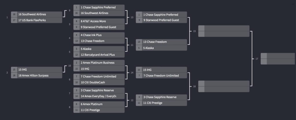 This year I thought I’d try a similar tournament to pick the “best” miles and points credit card. While the definition of a “best” credit card is fairly impossible to judge, since there are so many factors that go into that decision, most importantly figuring out where you want to go before you just sign up for cards, but hey, let’s give it a try!
