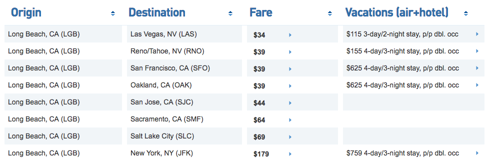 Long Beach also has some really inexpensive intra-California flights and to nearby states, with flights to Las Vegas and Reno/Tahoe both under $40.