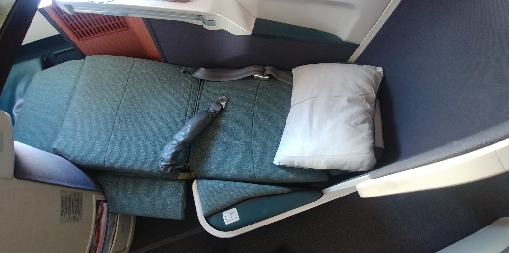 The A330 seats were comfortable and spacious, as you might expect from a premier business class offering. That spacious feeling was definitely helped in bed mode by side “wings” that folded out when the seat fully reclined. I never felt confined in the privacy shell, and also never got jostled by passing FAs or carts. I loved the texture of the seats too, as the fabric felt “homier” and thicker than some others.