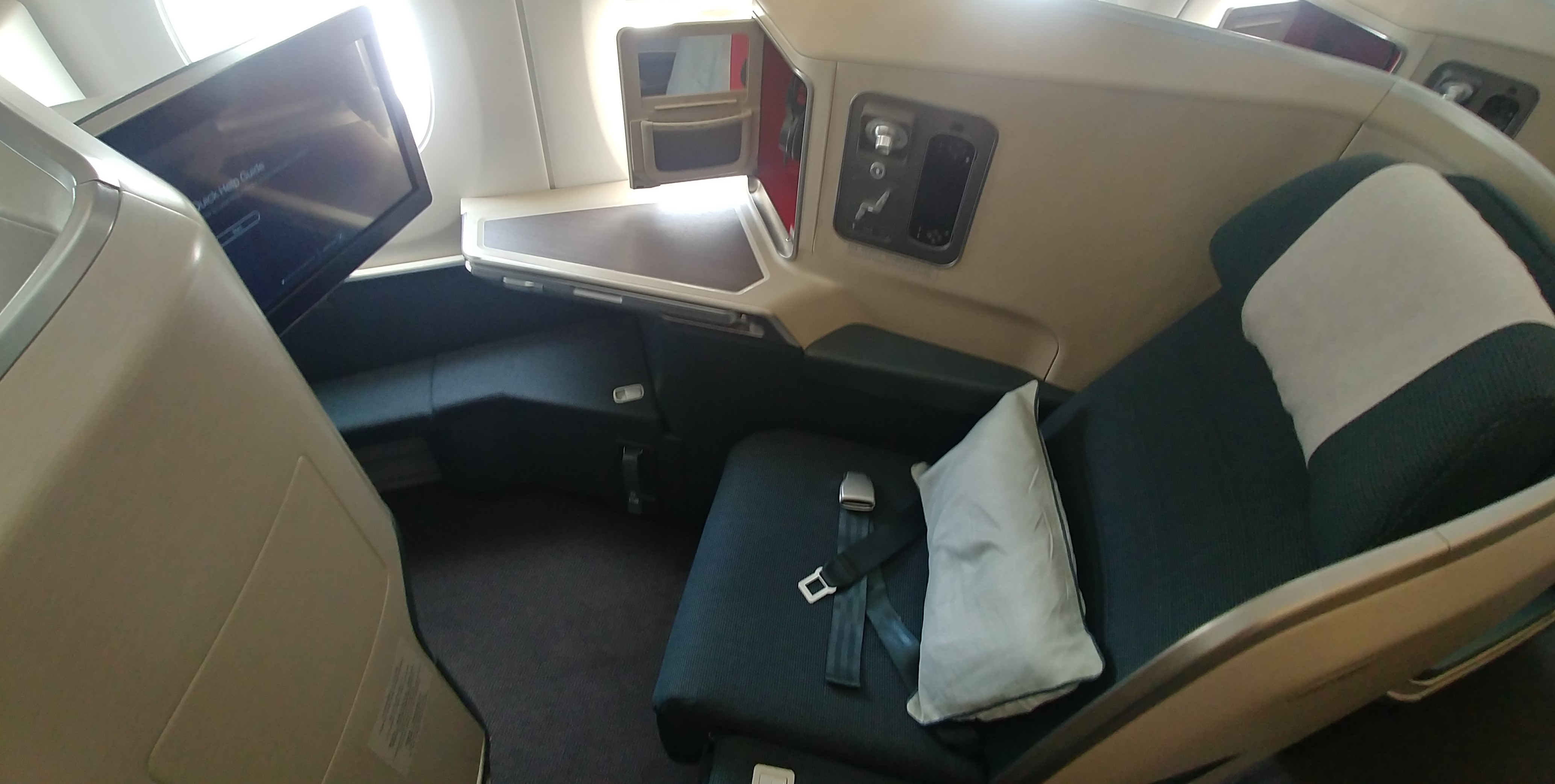 The newer A350 seats were remarkably similar to the A330. The finishes were newer and stylishly angled, and the IFE screen was much larger – with a new remote. But aside from the storage compartment being lidded (and thus usable gate to gate), they didn’t feel vastly superior. If you liked CX business class before, you’ll like the newer cabins even more.