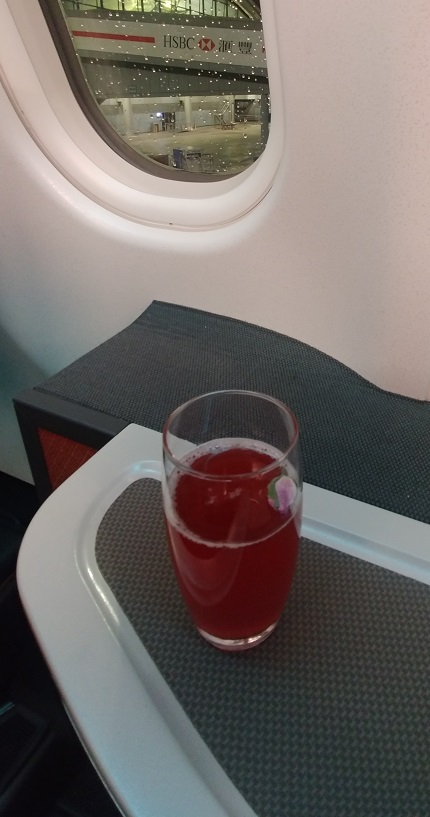 Attendants served pre-departure beverages before each flight. I chose the champagne (Tattinger Reserve) most times, though it tastes a little “boozy” to me. I also tried a CX signature plum juice/honey drink which was good if slightly cloying. FAs served quickly from a tray, and gathered at passenger leisure before takeoff.
