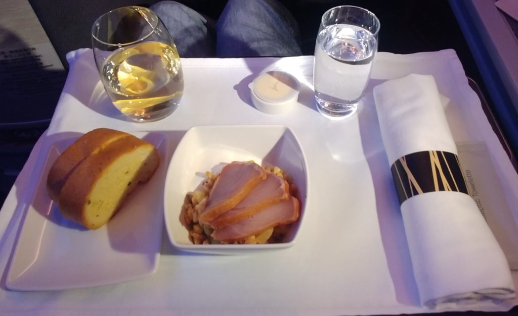 I generally choose “local” options on flights, so on the first flight I tried wok fried chicken with broccoli and jasmine rice. The dried beef and Pecorino cheese appetizer was the standout dish of all four flights. It was truly delicious, and something I’d expect to be served in a good restaurant on the ground. The chicken was good but no standout. In fact, that was generally the same story for every other dish on all four flights: good, but not great. All except one.
