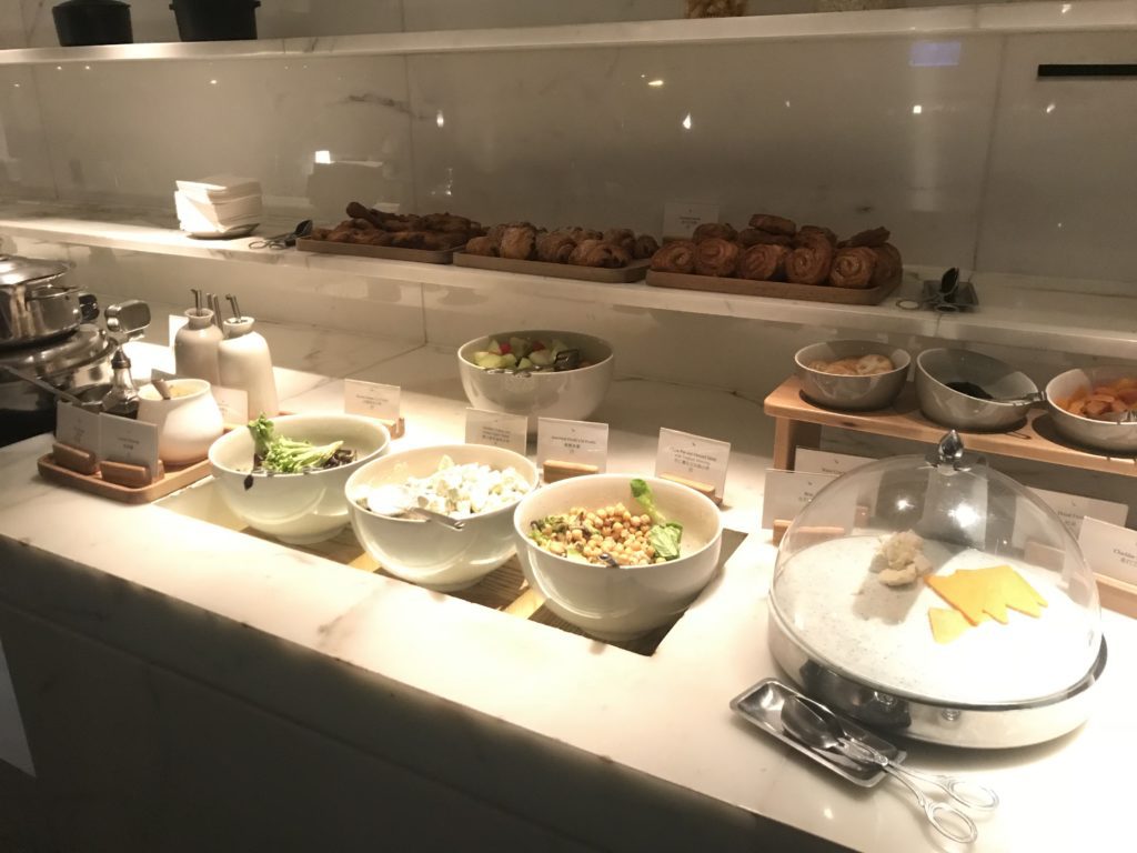 The Cathay Pacific The Wing business class lounge is one of the nicest lounges I’ve ever visited. And we didn’t even get to see all of it! The food options, even what is limited to downstairs, are good, and they have a reasonable selection of wines. The pre-flight shower after a day in humid Hong Kong was heaven. I’ve read about lounge shower many times, but this was the first time I actually have been able to use one.