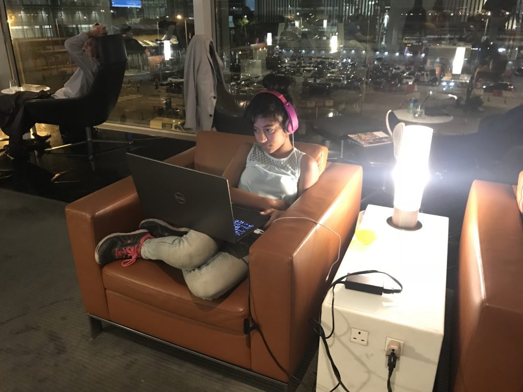 Finally, about an hour before boarding, I called it quits on the school. My daughter was totally exhausted by this point and just wanted to sleep. She’d have an opportunity soon enough once we boarded our flight, unaware of how nice it would be to do so in our business class seats.
