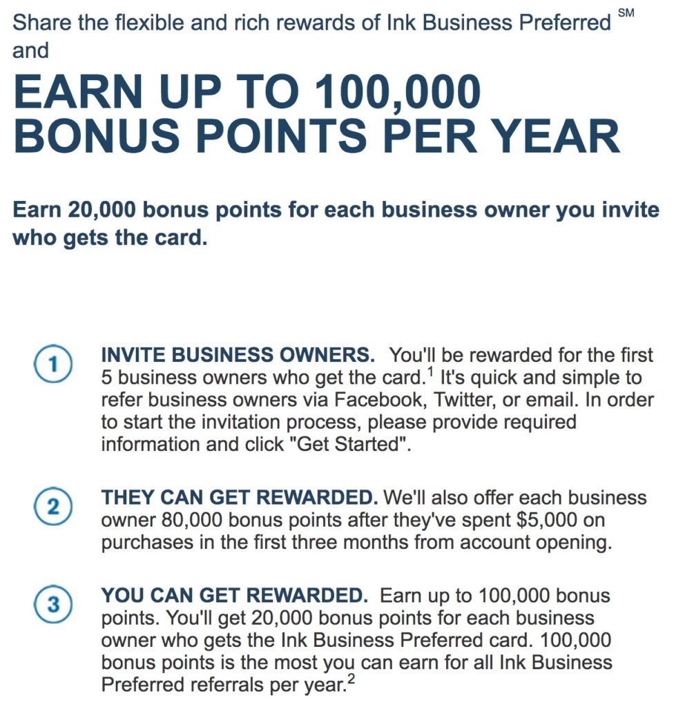 Refer a friend Chase Ink is back! This is a promotion that Chase seems to do every couple of months with various of its cards. Currently the bonus for the Chase Ink card is up to 80,000 Chase Ultimate Rewards points and if you already have a Chase Ink card, you can refer your friends and earn 20,000 Ultimate Rewards for each friend that signs up. If you would like to support this blog by signing up for the Chase Ink Preferred card with the 80,000 Ultimate Rewards offer, you can do so here, and feel free to leave your referral links in our free miles and points Facebook group.