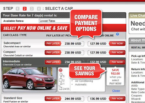 Normally, the Pay Now provides a significant discount over Pay Later – I assume because somewhere around 30% of people that reserve rental cars never show up. So it’s in the rental car company’s interest to “lock” you into showing up, even if it means they have to offer a discount.