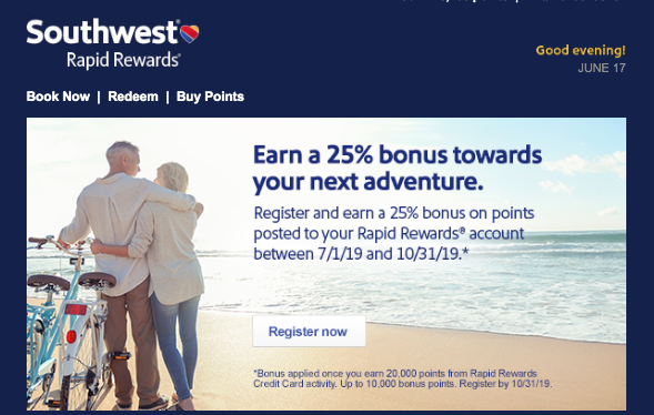 - Register between 6/7/2019 and 10/31/2019 11:59 p.m. ET and have a minimum of 20,000 points earned from Rapid Rewards Credit Card post during the promotion period of 7/1/2019 and 10/31/2019.