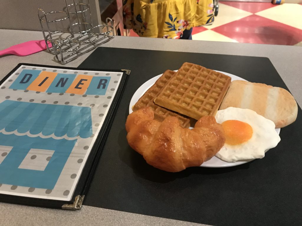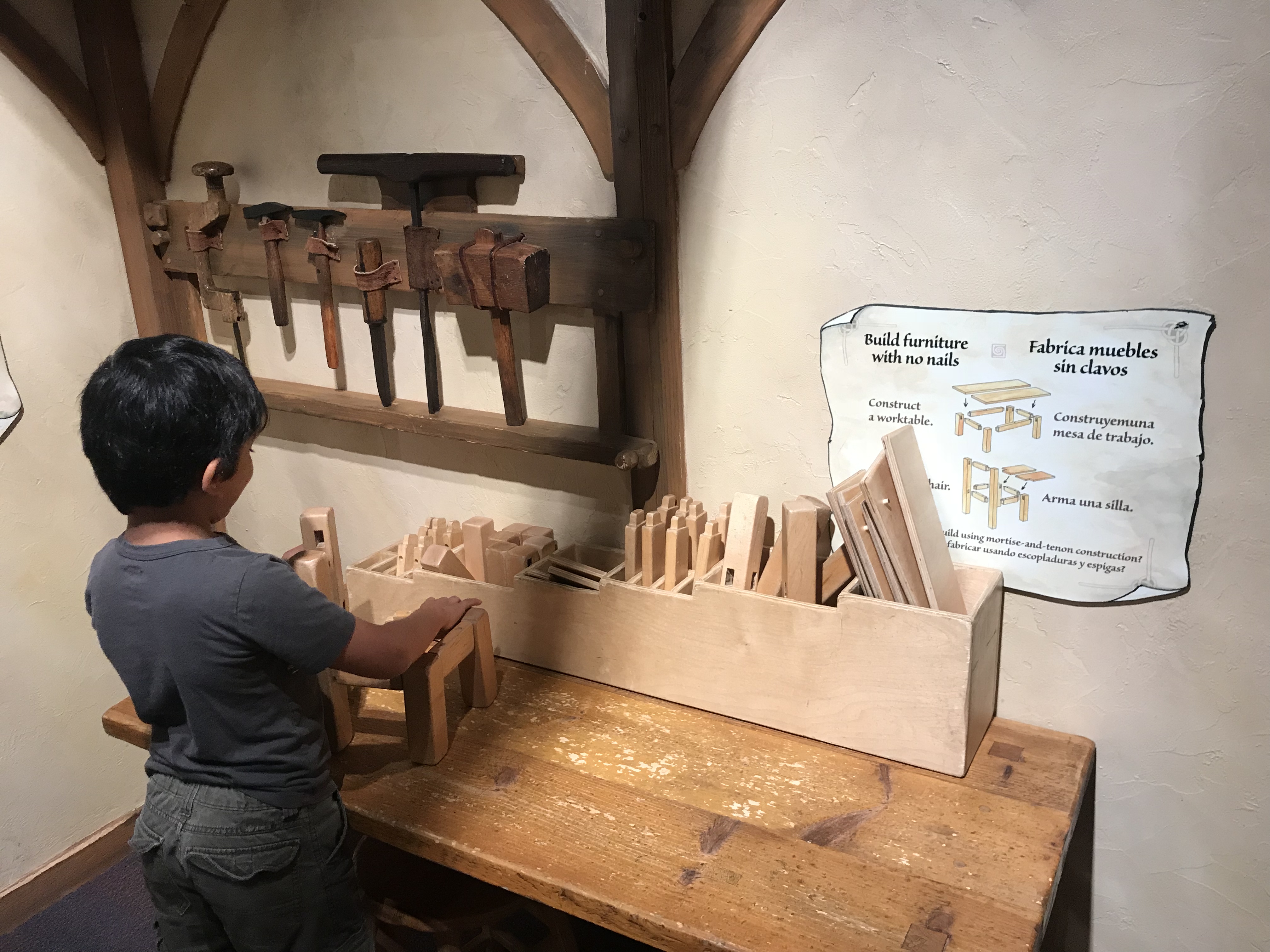 We had some fun playing dress-up, constructing nail-less furniture, and cooking. The furniture was by far the most engaging, since it was a puzzle to put together. The other areas lost their appeal ratehr quickly for my almost eight-year-old. Had my four-year-old been with us, he surely would have enjoyed both the dress-up and the kitchen immensely.