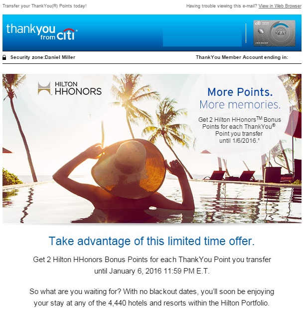 I got an email this morning that from now until January 6, 2016, Citi ThankYou points will transfer 2:1 to Hilton HHonors points (normally they transfer at 1:1 ). So 10,000 ThankYou points would be 20,000 Hilton points.