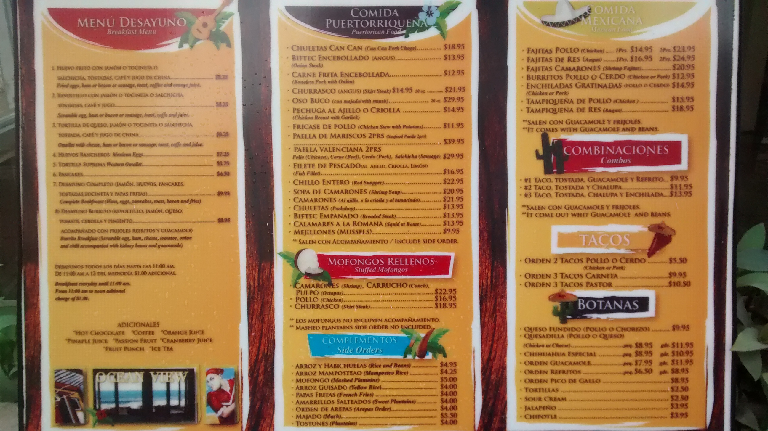 It actually reminded me of some of the Mexican restaurants back home, where everything seems a little shady and things are written down just more for guidelines than any type of rules. For example, on our 2nd trip, we ordered the arroz y habichuelas, mofongo and tostones, and the bill came out with each of those charged at $4.50. Compare that to the actual menu (our appetizers are in the bottom of the middle column and have menu prices of $4.00, $4.95 and $5.00)