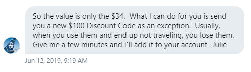 The second thing they did was send me another $100 discount code as a one-time courtesy. This was a very kind gesture, and would make up for the $100 I was lacking trying to re-book flights.