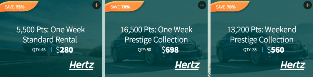 - 5,500 Hertz Gold Rewards points for $280, enough for one week standard rental; 45 packages available.