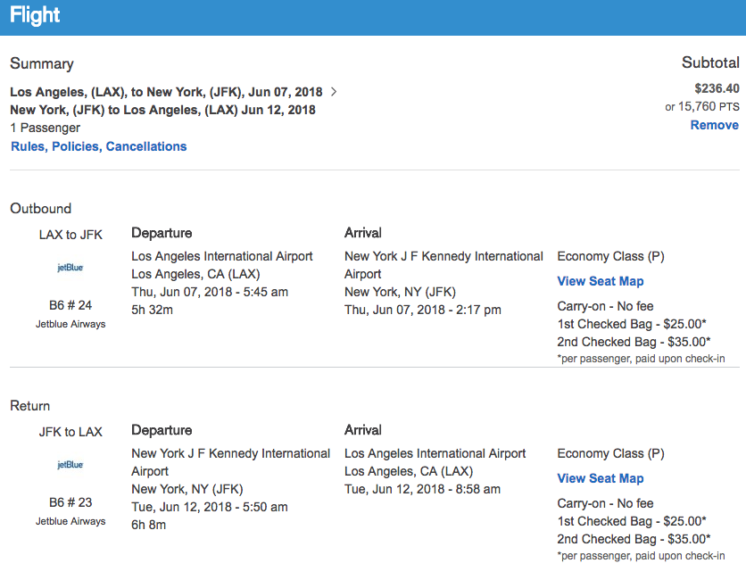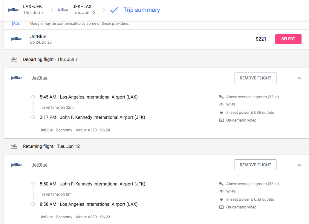Sample: Los Angeles to New York City (June 7 to June 12)