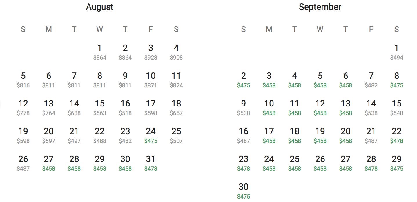 Sample $457 roundtrip (Aug 28-Sept 4)