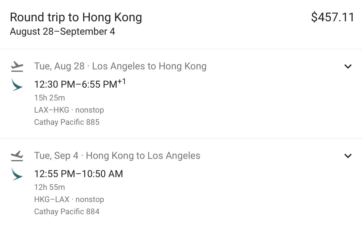 - Los Angeles to Hong Kong roundtrip