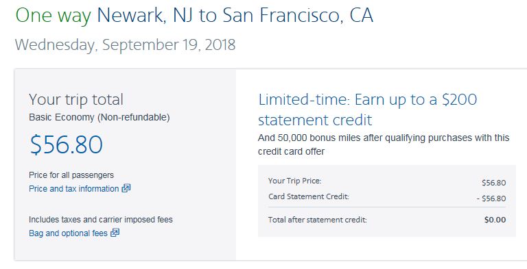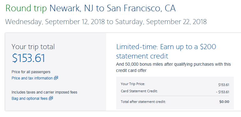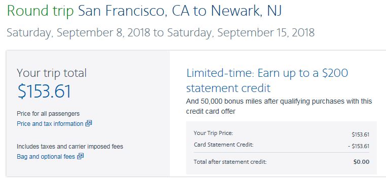 Sample roundtrip from New York (EWR) to San Francisco (SFO)