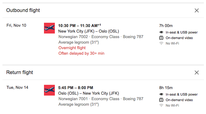 There are plenty more, so I’d head over to Google Flights on the double to get in on this deal while you can! Remember, Norwegian is a low-cost carrier, so expect to pay for seat assignments ($45), checked baggage ($90), and food/drinks ($1-$20).
