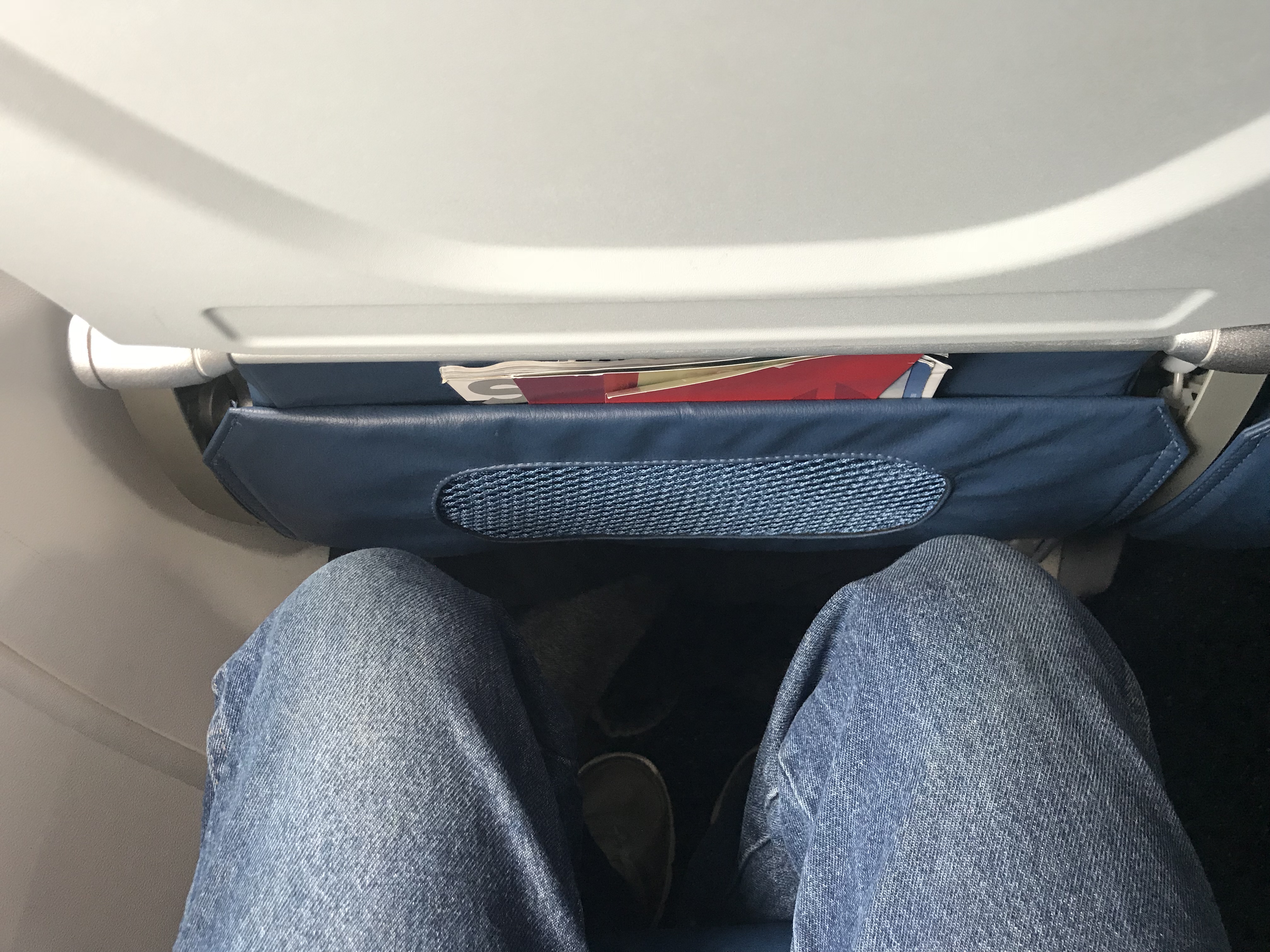 Legroom is pretty much standard for a U.S. carrier at 30” of pitch. I’ve never really felt cramped and always have a few inches of knee room. Sitting on the aisle helps. The one plus was that I didn’t stow a bag at my feet this time (backpack went in the overhead, since I was lacking a carry-on), so things actually felt a bit more roomy than usual. My photo, though, is from one of my previous trips where I was in a window seat. I’m a hair over 5’10”, for reference.