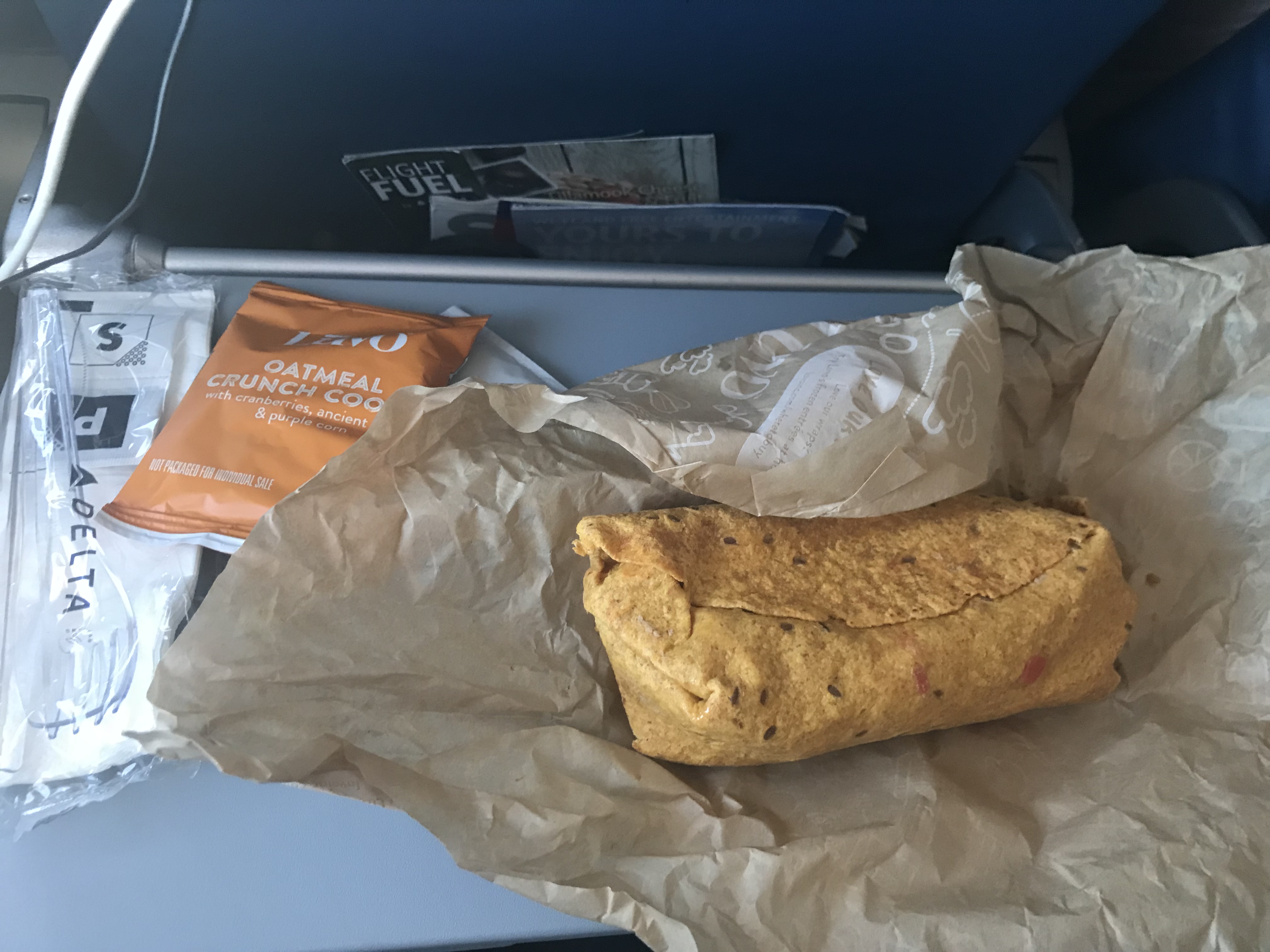 But Delta hasn’t let me down with the meal options or service. I order food at least half the time I fly. This flight was serving the breakfast options, as it was an early departure. The lunch and dinner options are served on flights that depart later than 9:00 a.m.