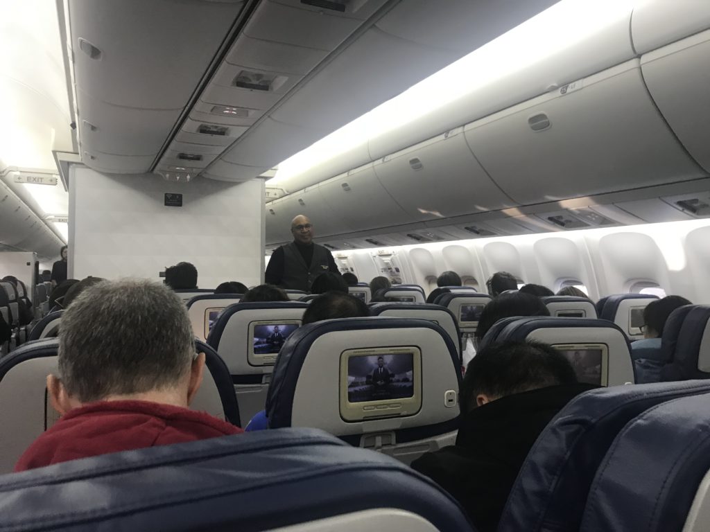 The plane was completely full. I’m not sure if this is consistent for Delta’s Beijing flights, but I hadn’t anticipated this. It didn’t help that the Boeing 767 felt tight after our last Delta economy long-haul flight on a 777 (SEE: Delta 777 economy review: Seattle to Paris). Since we were now among the last to board the Delta 767 economy class cabin, it was chaos around us. We miraculously found two bin spots for the kids’ small luggage and settled into our seats. I had to stuff my backpack under the seat in front of me, something I’d hoped to avoid. Given that Delta offers 2 free checked bags on flights to Asia, I was surprised at the completely packed overhead bins. The flight attendants did their best to get people situated, the door closed, and the safety briefing started as quickly as possible.