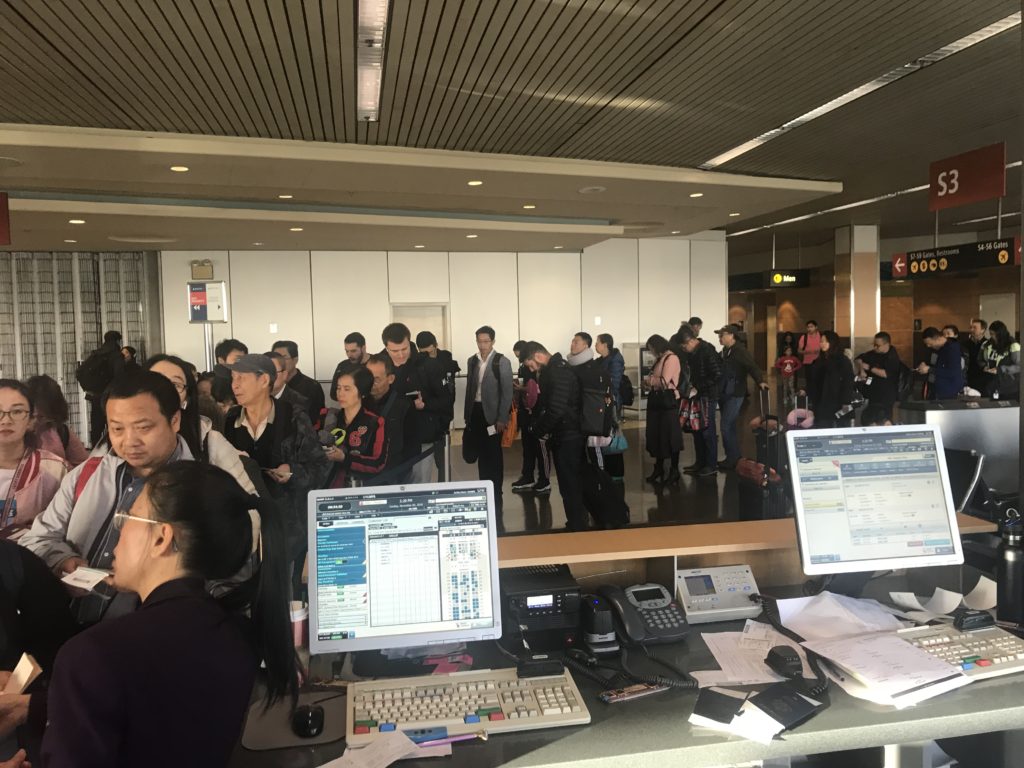 When moseyed over to the gate just before boarding started. I handed all of our passports and tickets to the gate agent, organized by passenger, when we reached the front of the queue. She thumbed through my passport and asked if I had a Chinese visa. I said no, and that we’d be transiting without a visa under the 144-hour policy.