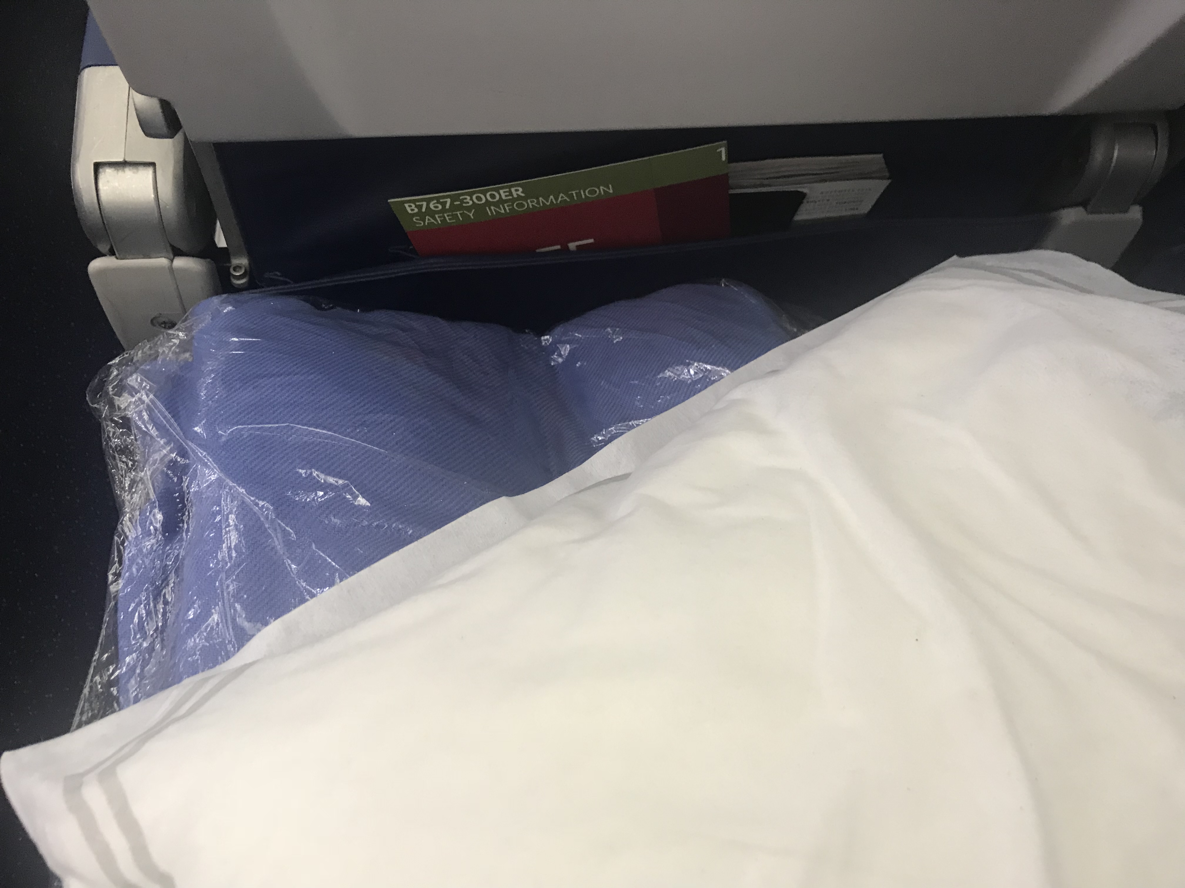 The first thing I noticed was how tight the seats are. I’m pretty sure the pitch is the same as on the 777, but the 767 felt a bit more cramped. I guess the one difference was that I had a backpack at my feet this time since I couldn’t stow it overhead. I know backpacks are typically supposed to go under the seat, but when it *is* my entire carry-on, I like to store it in the bin. At each seat were a pillow and blanket.