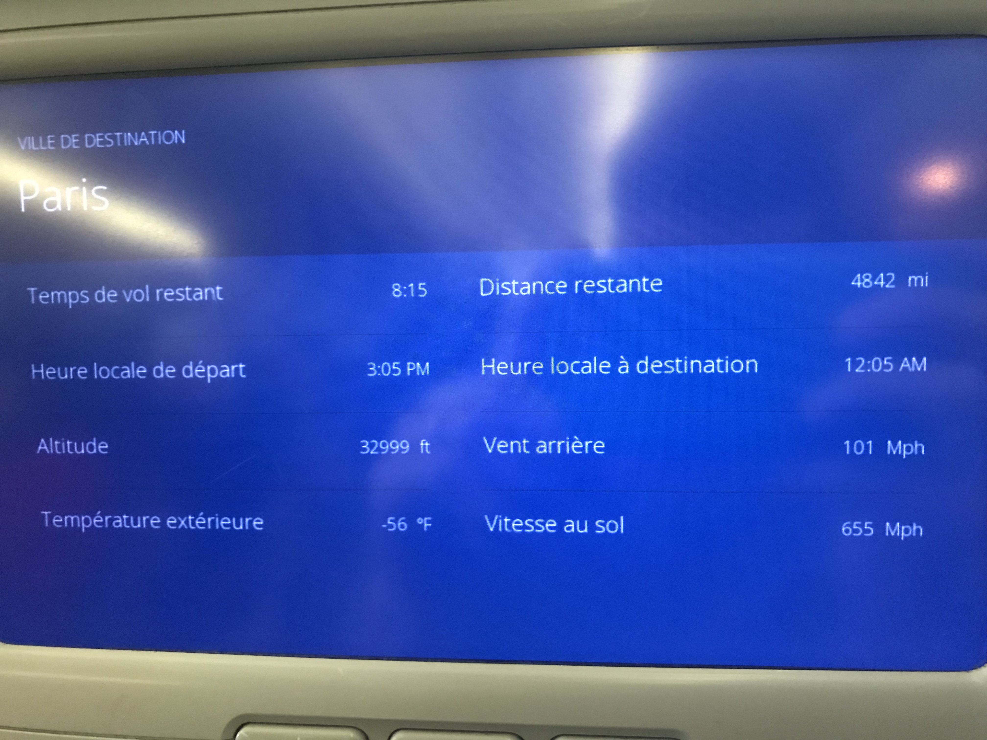 Aided by a 100-mph tail wind, our flight time was only 8.5 hours. We should arrive in Paris only a few minutes late.